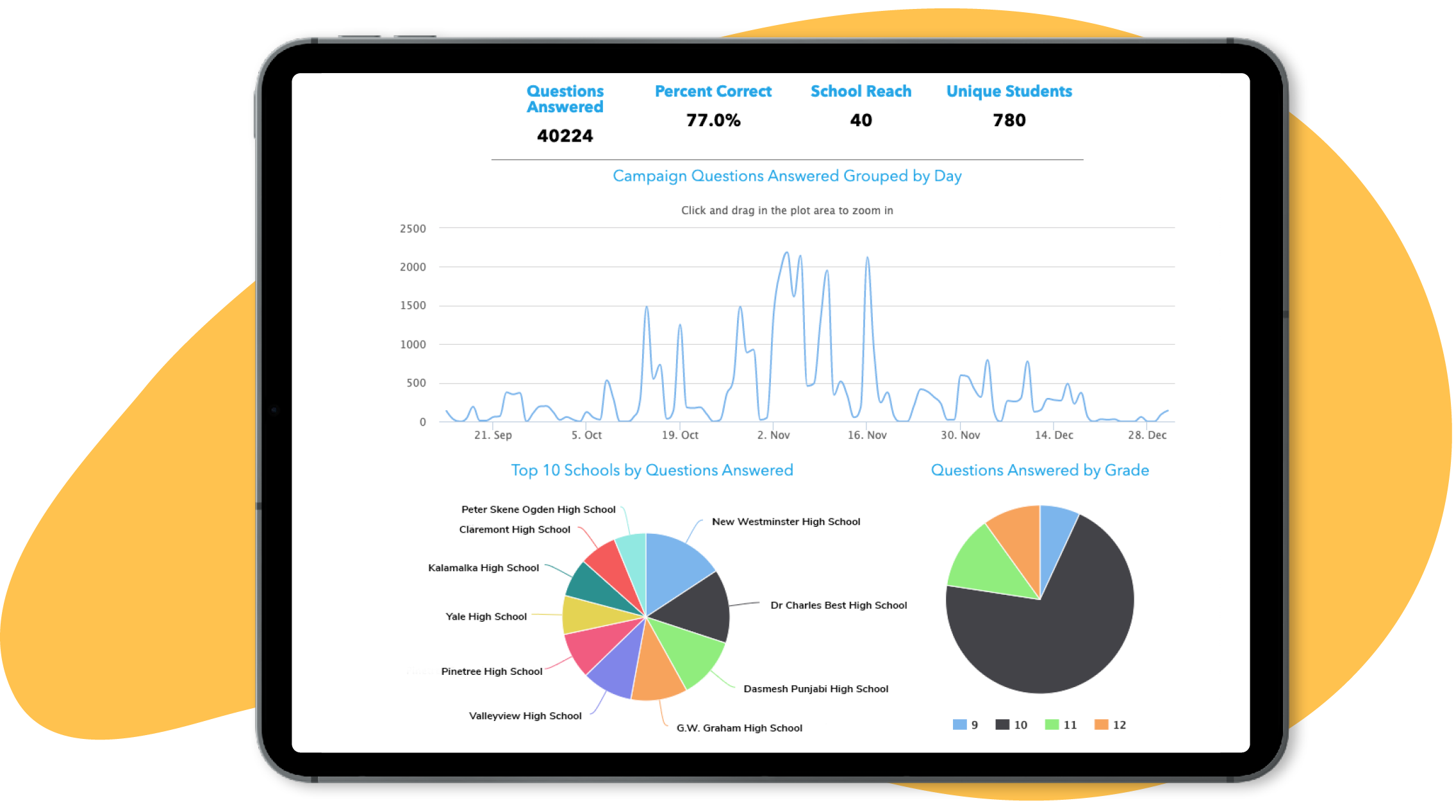 Detailed reports show engagement metrics such as the number of students who visit your website and engage with your information. Partner dashboards show key metrics such as school and student reach, grade levels and aggregated details about levels of interest and awareness in your programs.
