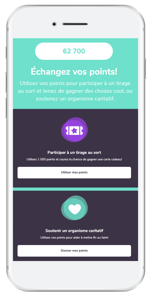 Gagnez des points pour gagner un prix ou pour donner à un organisme de bienfaisance.