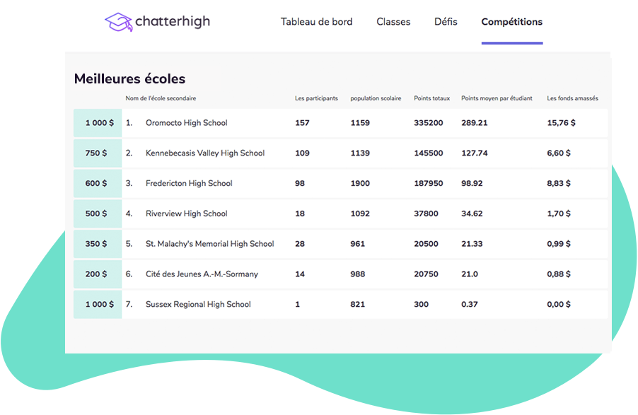 En tant que ressource ludique, nous créons constamment des moyens passionnants d'engager vos élèves. Nous organisons des défis nationaux et régionaux et des championnats tout au long de l'année scolaire qui permettent à vos élèves de compétitionner pour récolter des fonds pour la classe.