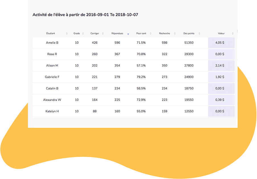 Vous verrez le nombre de questions auxquelles ils auront essayé de répondre, et le nombre de bonnes réponses. Nous calculons automatiquement leur note pour n’importe quelle période de temps choisie. De plus, vous pouvez voir combien de points chaque élève a donné à un organisme caritatif.
